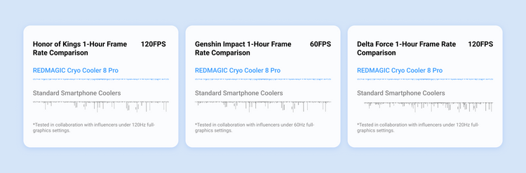 *Data sourced from REDMAGIC Labs. Tested at 25°C ambient room temperature, with the cooler suspended and Destroyer Mode activated. Surface temperature measured as low as -25°C.