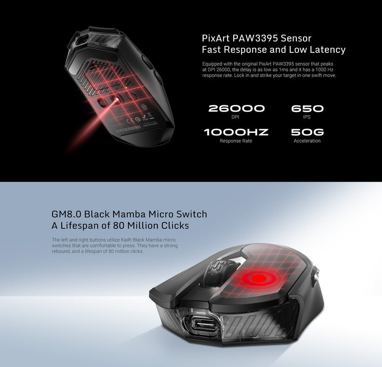 PixArt PAW3395 sensor | GM8.0 Black Mamba Micro Switch | Tri-mode Connectivity | 75g Lightweight Design